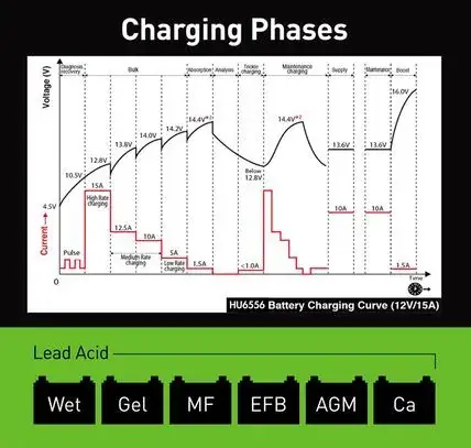 Charges all battery types including Lead Acid, GEL, MF, EFB, AGM and Calcium