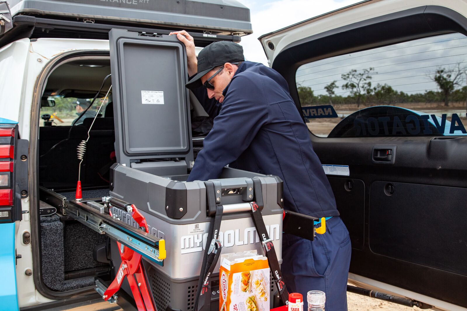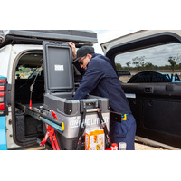 Quick handle-activated lift and lower - pull the ergonomic lever, slide your fridge out, then let the gas-strut assisted scissor-lift gently lower it to your chosen height.