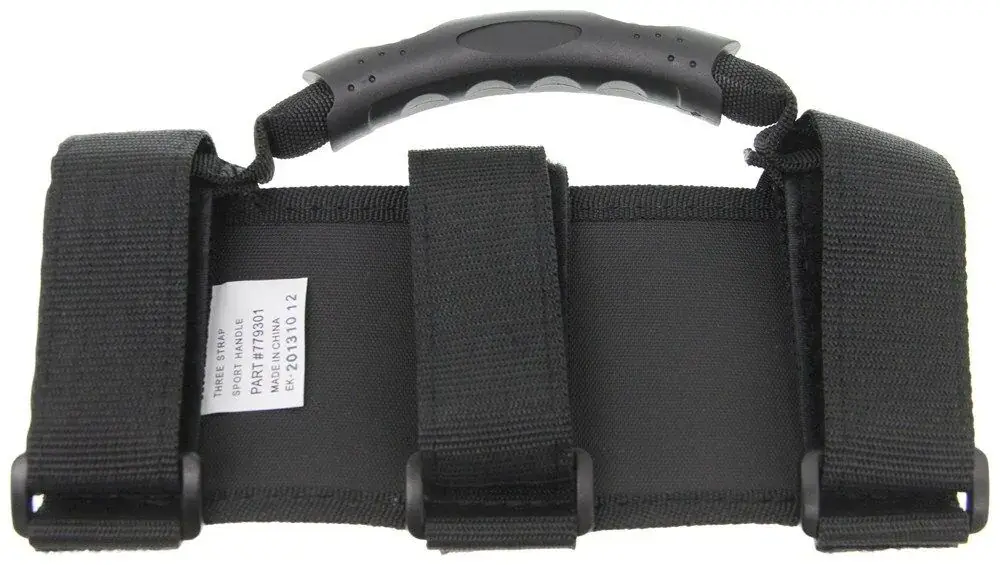 Rampage Black Extreme Sport Grab Handle help you getting in or out of the vehicle or hanging on during those bumpy off-road expeditions. Universal, adjustable, hook and loop attachment fits round or square bars - 2" to 5" diameter, use anywhere for assess or stability. Durable 1.5-inch nylon webbing with rigid grip and triple strap attachment. Unique, flexible 4-inch wraparound backing plate adds rigidity, prevents bunching & improves handle pull strength.
