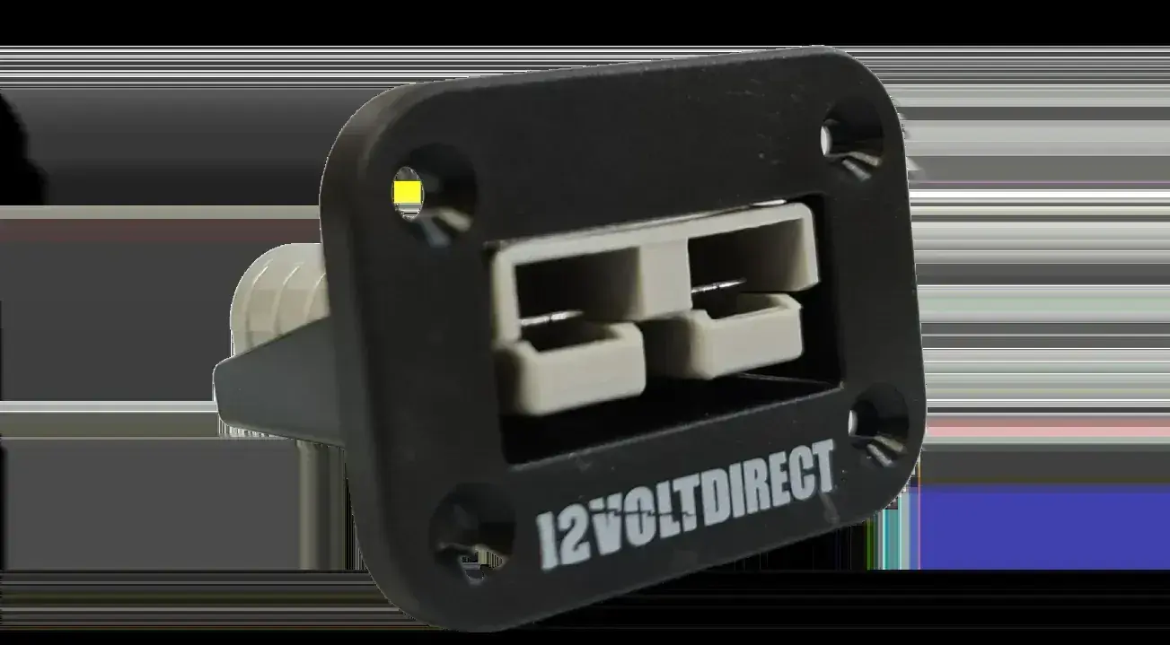 A flush mounting bracket with a recessed 50A Anderson connector for mounting into trims and panels.